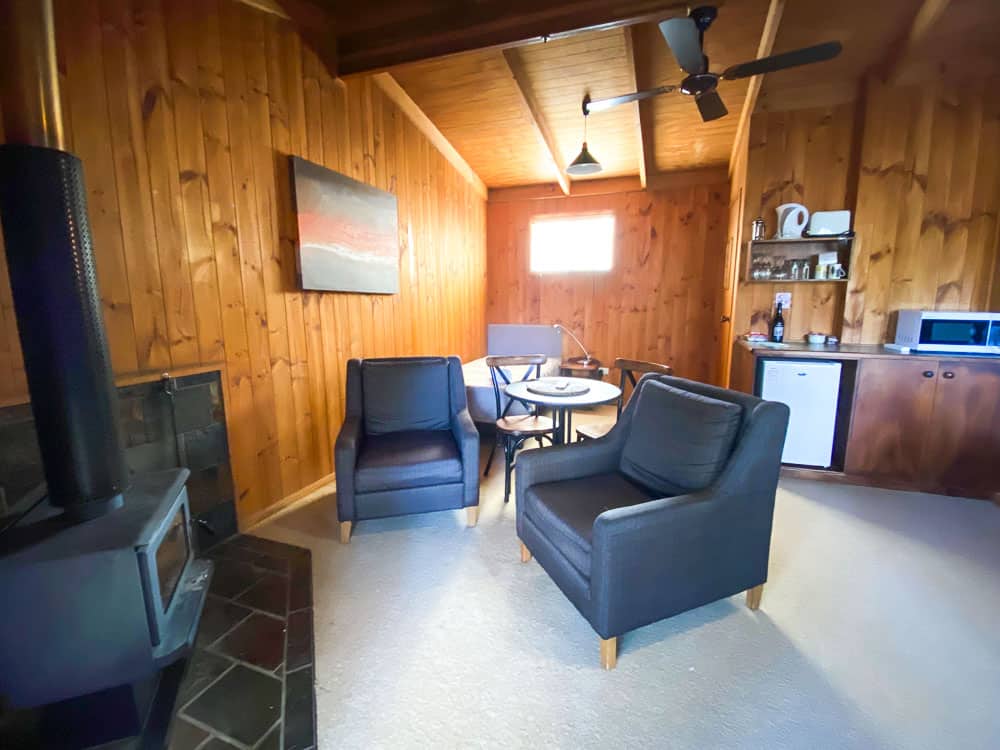 The timber cabins have a lovely little verandah overlooking the bushland and inside there is a small sitting area with two chairs and a small table around a fireplace. You are provided with a wood box on your verandah, a fire starter kit as well as being encouraged to gather kindling from around the property.