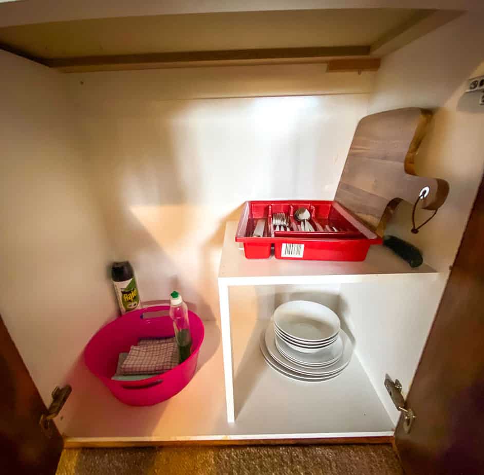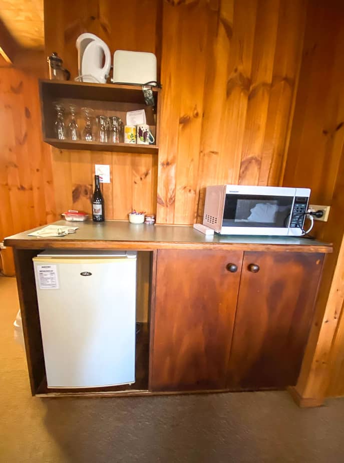 The cabin comes with basic cooking facilities such as a microwave, toaster, kettle and all the crockery you need (see image below). There is also a small fridge and tea and coffee provided.